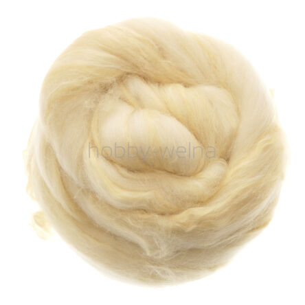Mieszanka wełny z Merynosa południowo-amerykańskiego 23 μ w kolorze białym naturalnym z dodatkiem włókna soi w kolorze ecru.